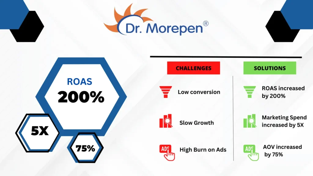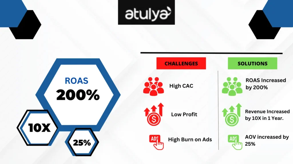 Increase ROAS by 200%. Increased Marketing Spend by 5X Average AOV increase by 75% Products sold effectively (from 3-5) to 25+ through FB, Instagram across funnels.