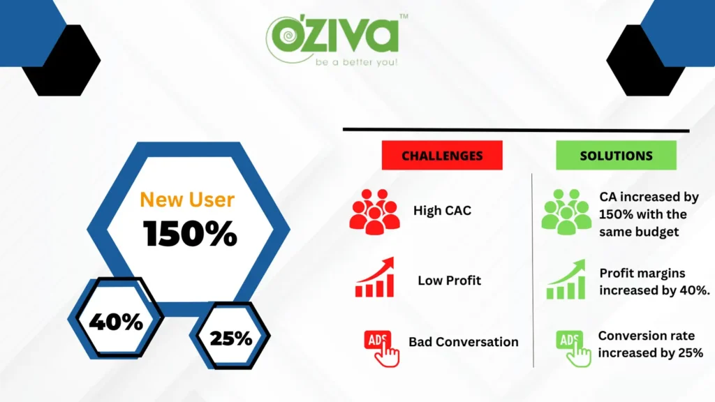 Monthly New User Acquisition increased by 150% with the same budget. Reduced the CAC by 40% Increased profit margins by reducing the reliance on discounting at scale.
